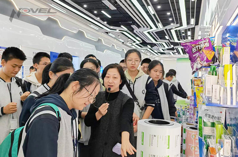 座談結束,在工作人員的帶領下,研學團隊先后參觀了永新股份展廳和MES系統控制中心。展廳內,各品類包裝產品、高性能薄膜琳瑯滿目,從食品包裝到工業應用,從環保材料到智能包裝,工作人員詳細介紹了產品的研發過程、性能特點及應用領域,讓同學們直觀感受到包裝材料的多樣“膜”力。MES系統控制中心內,永新股份信息部經理王健與同學們進行互動問答,現代化的智能管理界面實時呈現著生產全流程數據,同學們紛紛感嘆工業智能化帶來的高效與精準。