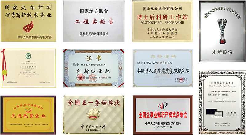 全國五一勞動獎狀;國家創(chuàng)新型企業(yè);中國創(chuàng)新型企業(yè)100強;中國包裝龍頭企業(yè);中國包裝優(yōu)秀示范品牌;國家首批資源節(jié)約型環(huán)境友好型試點企業(yè);全國就業(yè)與社會保障先進民營企業(yè);國家火炬計劃重點高新技術企業(yè);中國中小企業(yè)板上市公司50強;全國守合同重信用企業(yè);全國先進包裝企業(yè);全國企事業(yè)單位知識產(chǎn)權試點單位;全國輕工業(yè)先進卓越績效企業(yè);海關AA級企業(yè);中國醫(yī)藥包裝優(yōu)秀單位;安徽省人民政府質(zhì)量獎提名獎